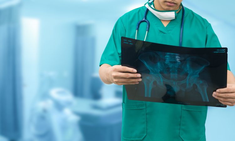 Surgical doctor examining xray film, diagnose patient 's waist bone. Surgery operation concept.